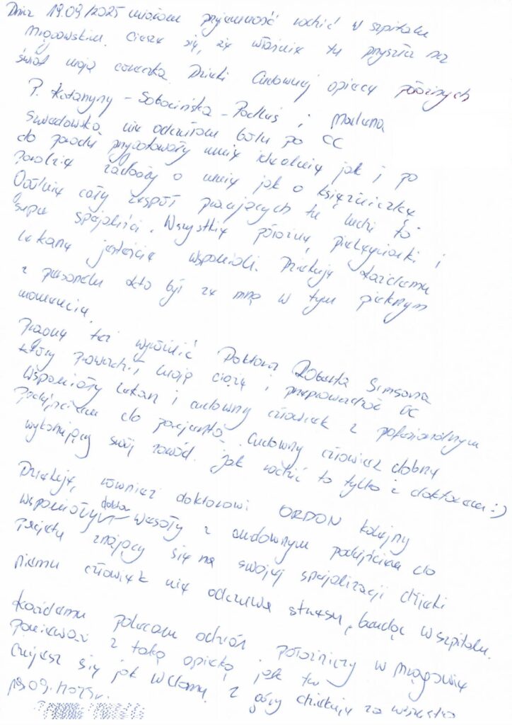 Ten pobyt w szpitalu i te kilka ciężkich dni upłynęły nam w bardzo milej atmosferze, a to było dla nas bardzo ważne. Codziennie moja córka otrzymywała pomoc nie tylko medyczną, ale również bardzo wspierano nas duchowo w córki chorobie i myślę, że to również pomogło jej szybko odzyskać siły.